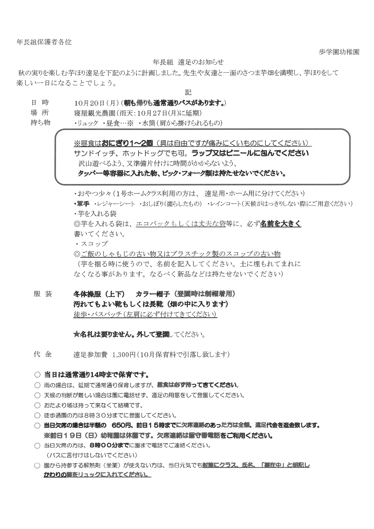 歩学園幼稚園のお知らせ