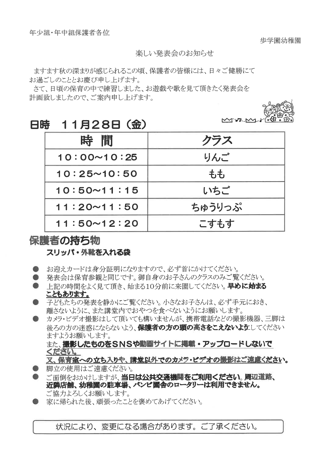 歩学園幼稚園のお知らせ