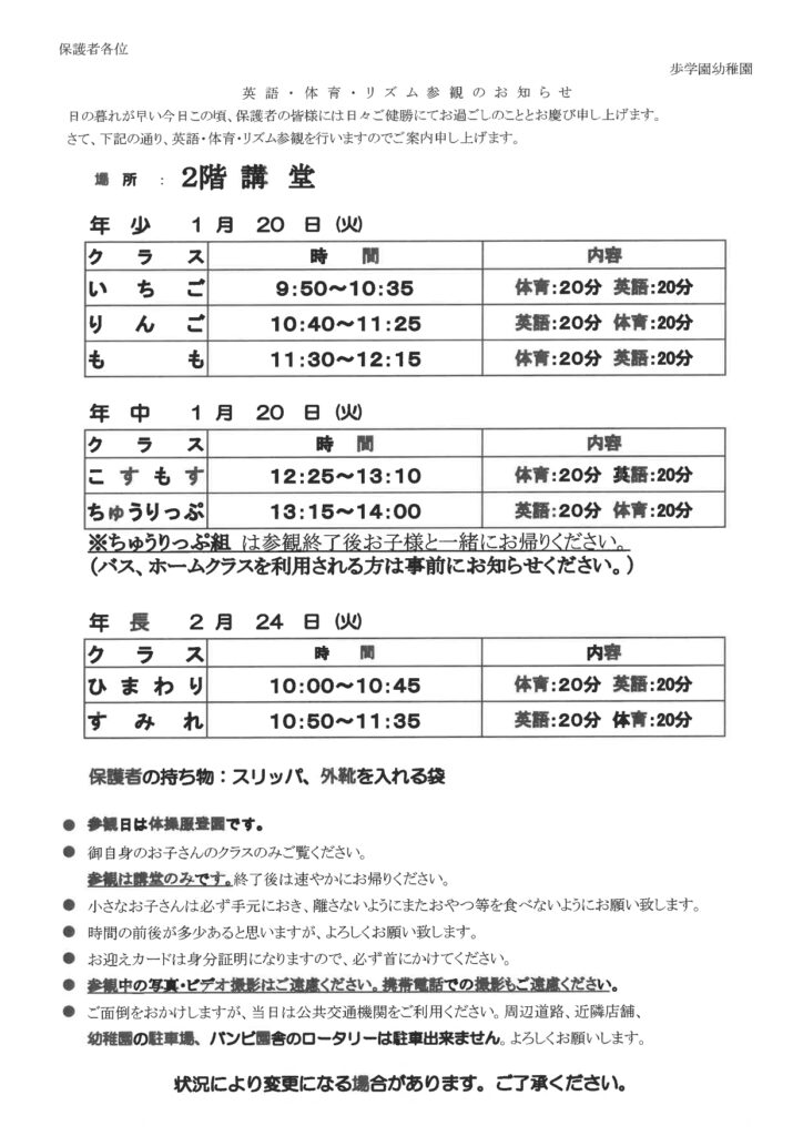 【年少・年中・年長】英語・体育・リズム参観のお知らせ