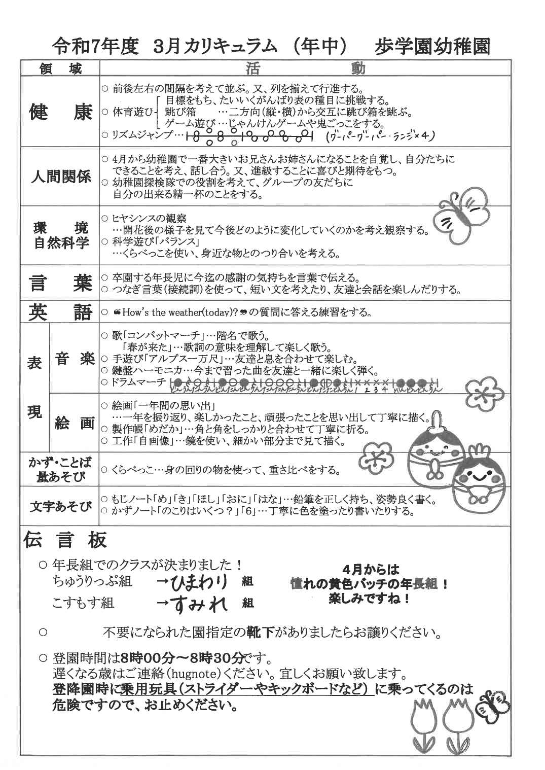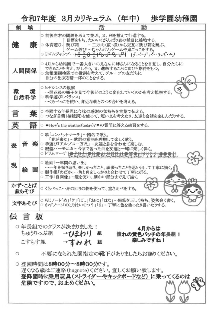 歩学園幼稚園のお知らせ