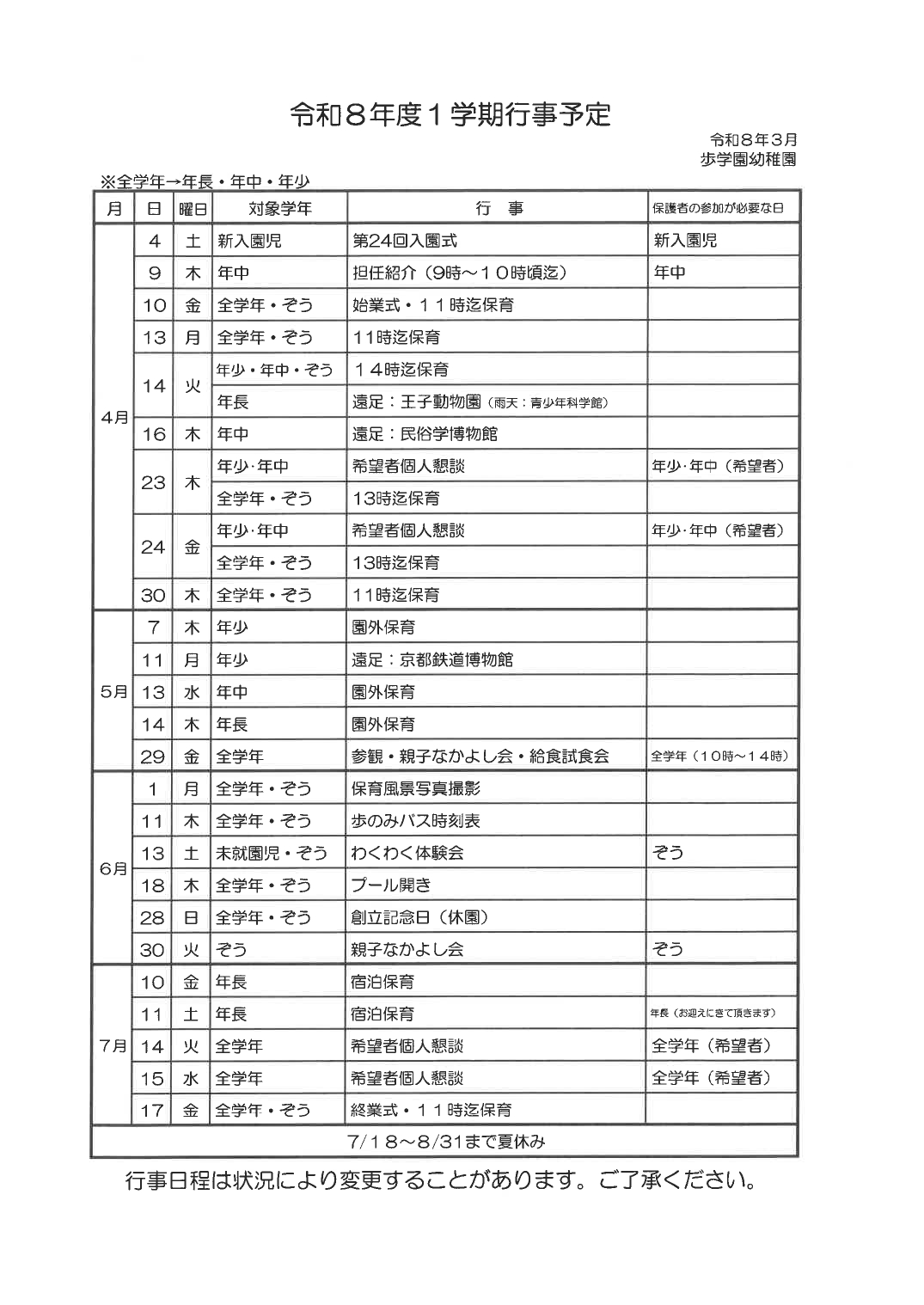 【幼稚園】令和8年度 1学期行事予定