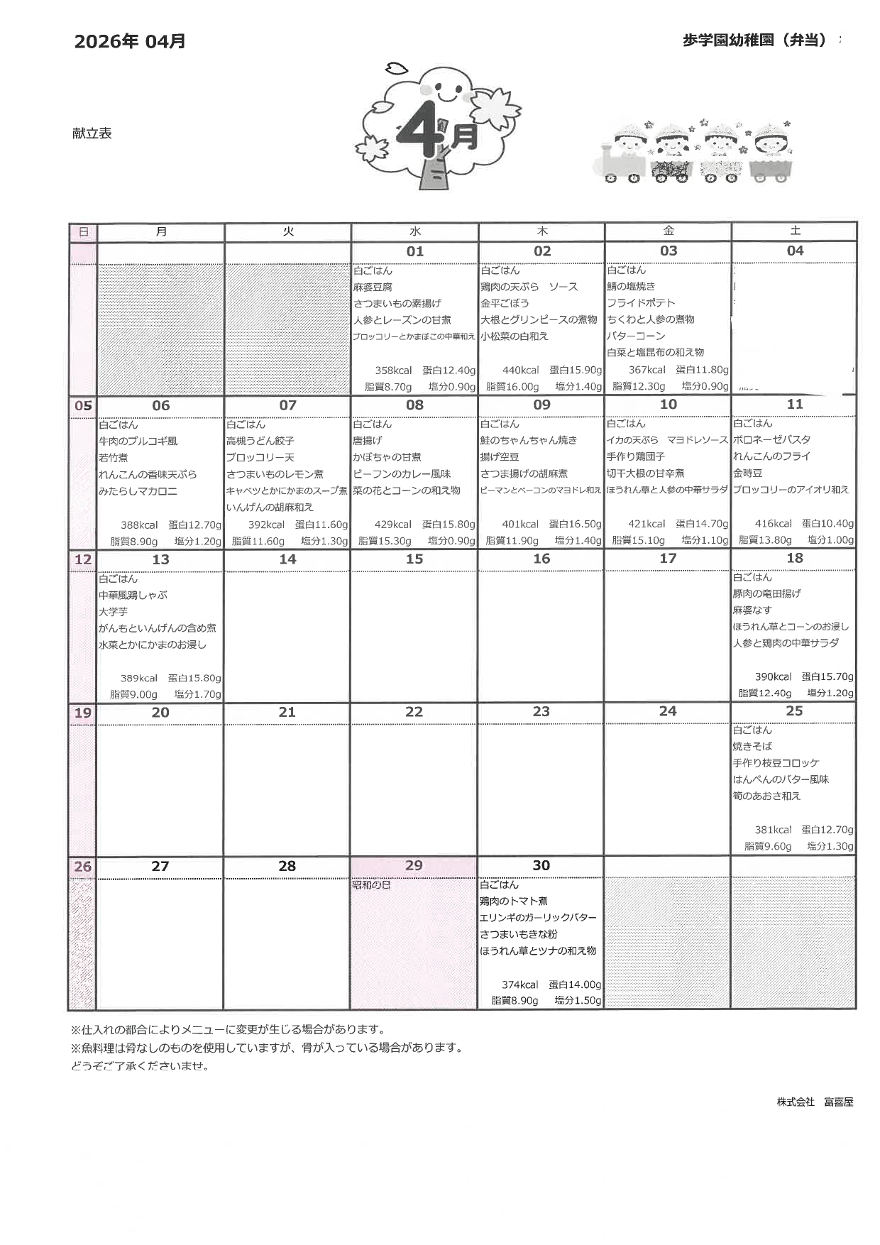 【幼稚園】4月ホームクラス給食献立