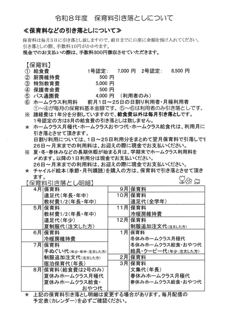 【年少・年中・年長】令和8年度 保育料引き落としについて