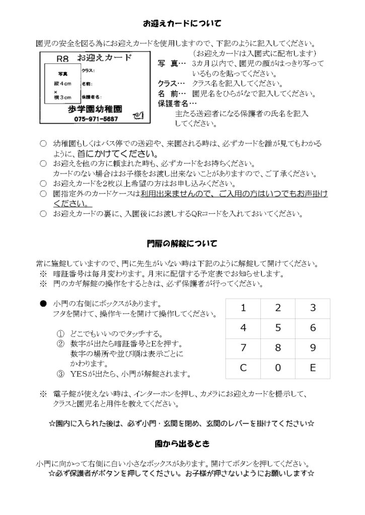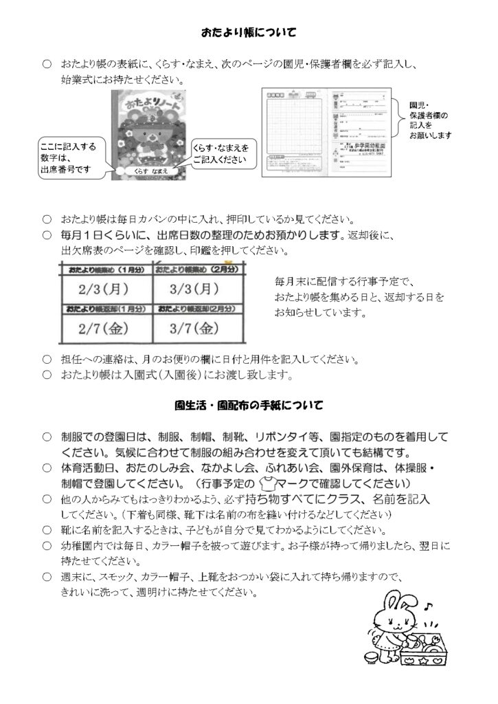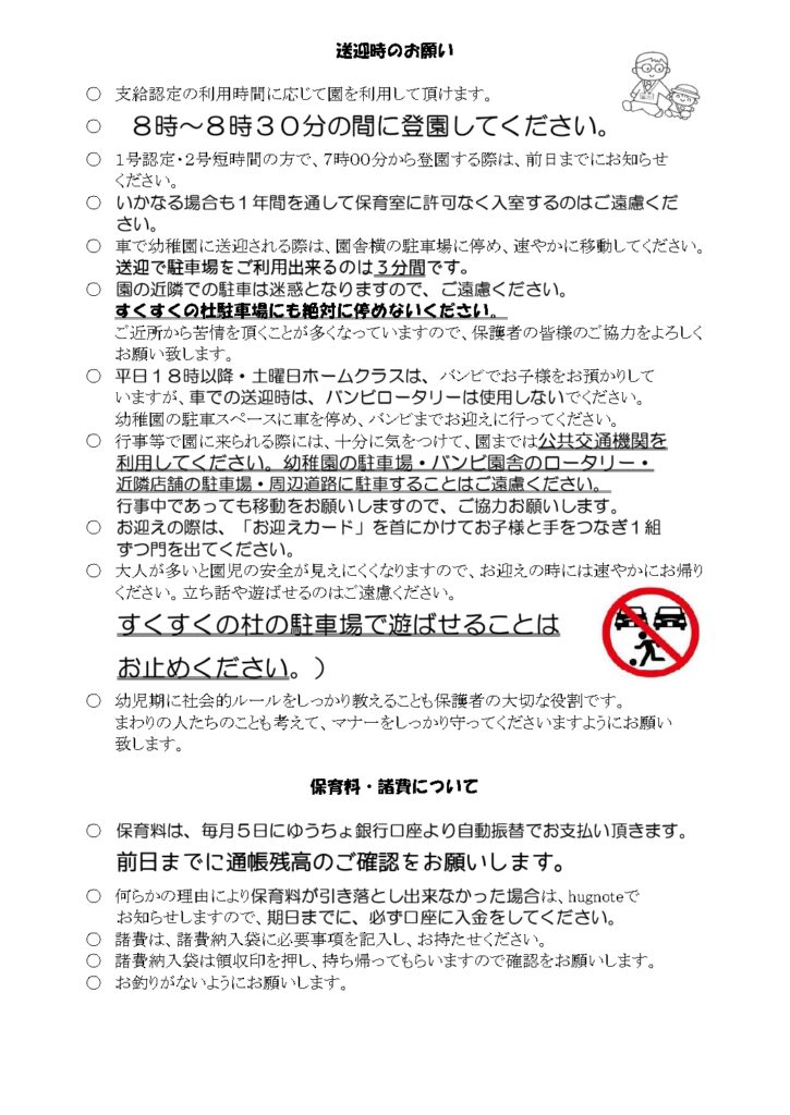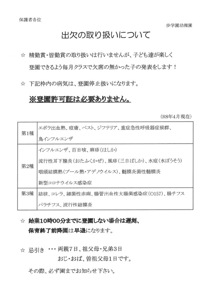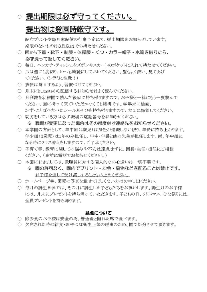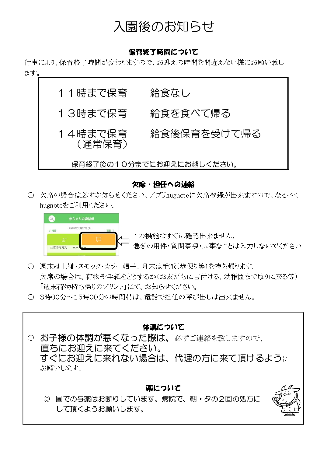 【年少・年中・年長】幼稚園について 2026.04.012026.04.09 通常保育時は8時30分までに登園してください。土曜日・代休・夏休み・冬休み・春休みなど、保育のない日は認定に合わせて登園してください。